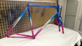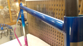 La grande difficulté de ce projet a été de conserver l'inox visible, tout en ayant certaines parties peintes à l'aide de coloris candy, en ayant en plus de ça des fondus entre les parties peintes et les parties inox brut. Les peintures candy étant translucides, il faut faire preuve de beaucoup de minutie et de vigilance pour ne pas avoir d'écart de teinte : il suffit en effet d'un peut trop insister à un endroit plutôt qu'à un autre pour que la différence d'épaisseur dans la peinture entraine une différence de profondeur dans le coloris, qui peut s'avérer redoutablement difficile à corriger.