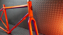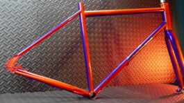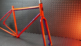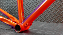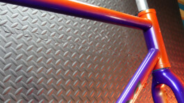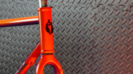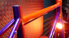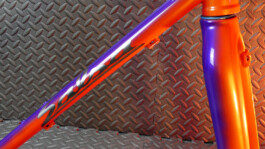 Il a finalement opté pour un linear fade, tels que ceux que l'on peut admirer sur les vélos Klein. La petite touche en plus, ce sont deux coloris nacrés du plus bel effet, dont les reflets proposent des nuances terriblement sexy. Le logo argenté apporte une petite touche de brillance en plus... Et puis l'avantage, c'est que d'un côté, le vélo est orange, et de l'autre, violet !